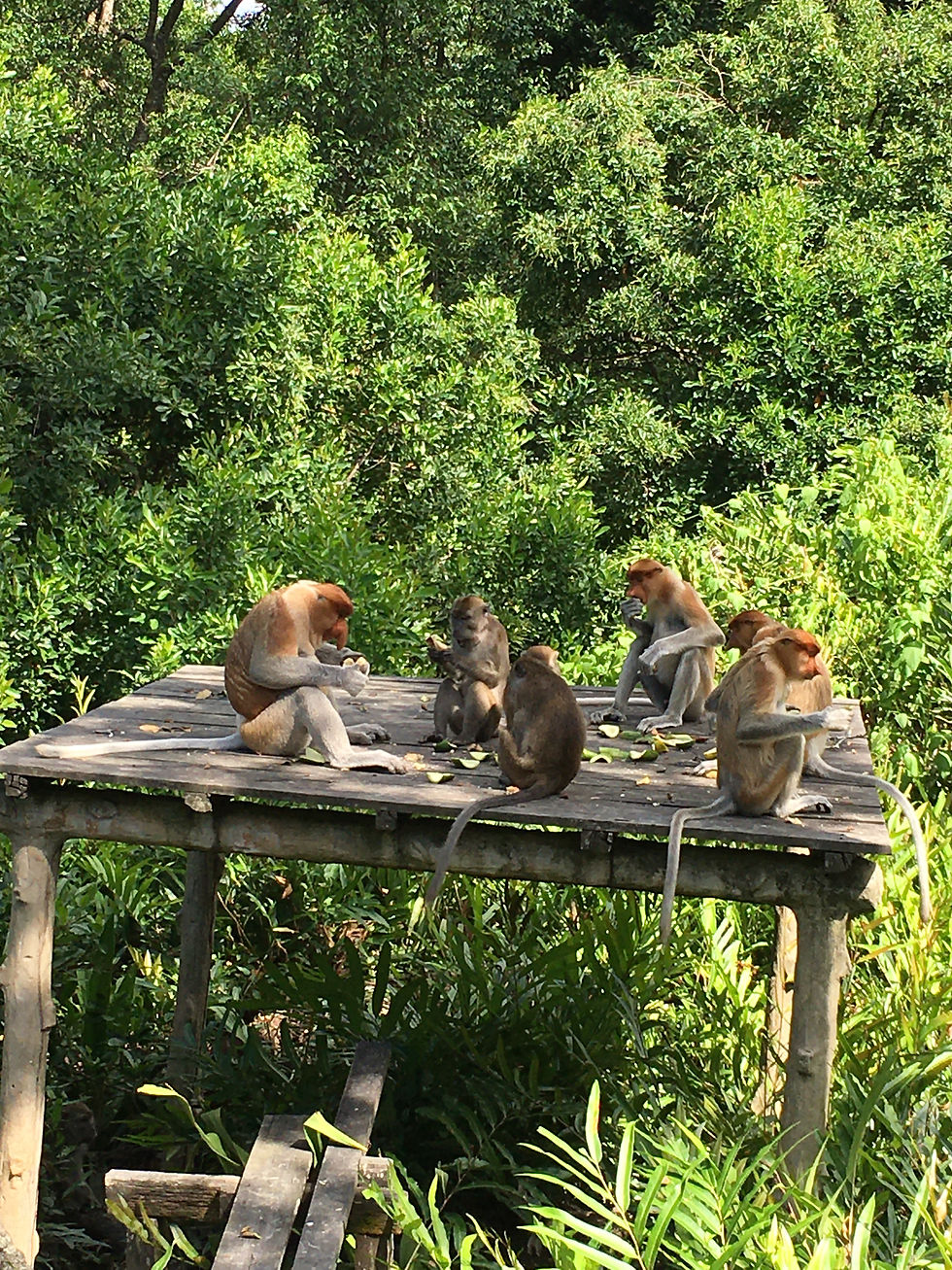 Breakfast was also to serve as lunch as we were going to see the proboscis monkeys a 45 minute drive away and needed to be there for their feeding time. The drive took us past a lot of palm oil plantations, reminding us of the struggle a lot of wildlife here has as its territory is reduced in size and has become more fragmented. A little piece of jungle here protects this group of monkeys and feeding them supplements what they can find in the jungle.